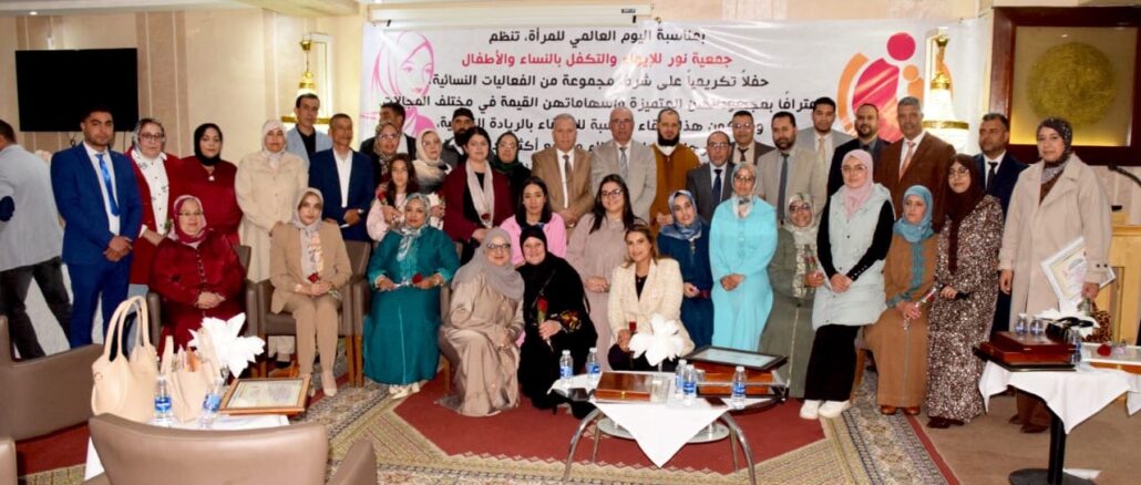 بمناسبة اليوم العالمي للمرأة، وبحضور السيد وكيل الملك لدى المحكمة الابتدائية بسيدي بنور والسيد رئيس المحكمة، نظّمت جمعية “نور للإيواء والتكفل بالنساء والأطفال” حفلاً تكريمياً متميزاً احتفاءً بمجموعة من الشخصيات النسائية البارزة في مدينة سيدي