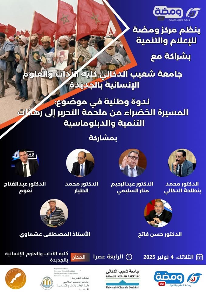 في إطار تخليد الذكرى الخالدة للمسيرة الخضراء المظفرة، ينظم مركز ومضة للإعلام والتنمية بشراكة مع جامعة شعيب الدكالي – كلية الآداب والعلوم الإنسانية بمدينة الجديدة، ندوة فكرية وطنية تحت عنوان: “المسيرة الخضراء: من ملحمة التحرير إلى رهانات التنمية والدبلوماسية”، وذلك يوم الثلاثاء 4 نونبر 2025، على الساعة الرابعة زوالا، بفضاء كلية الآداب والعلوم الإنسانية بالجديدة.