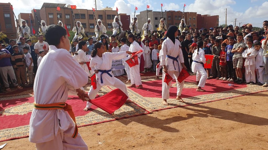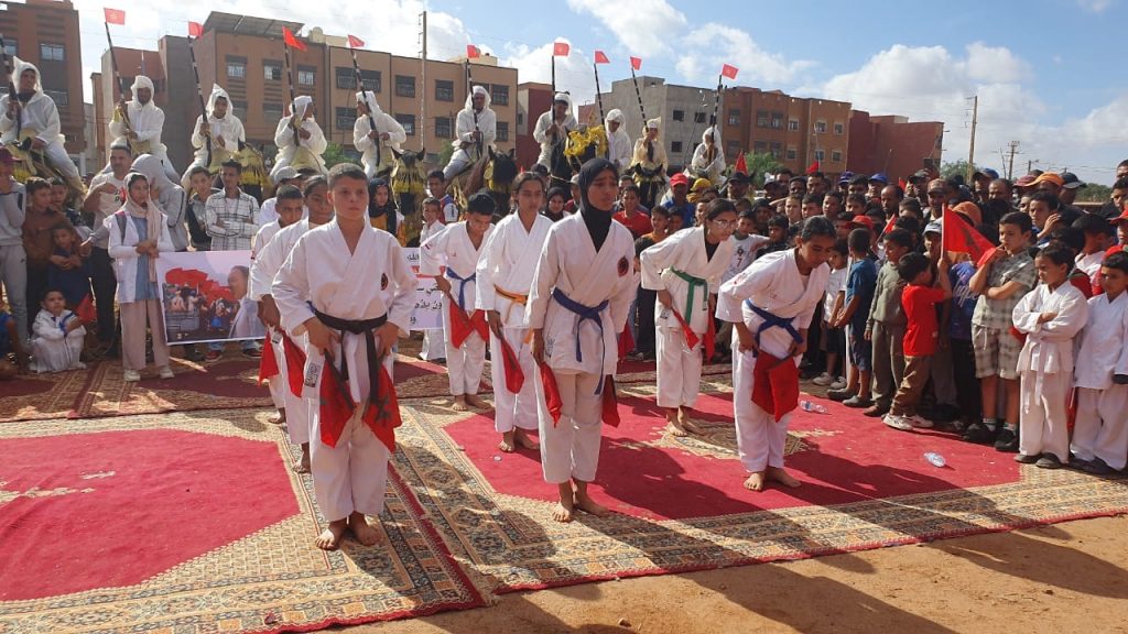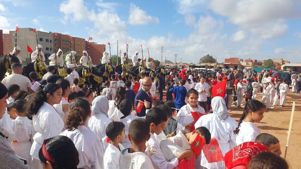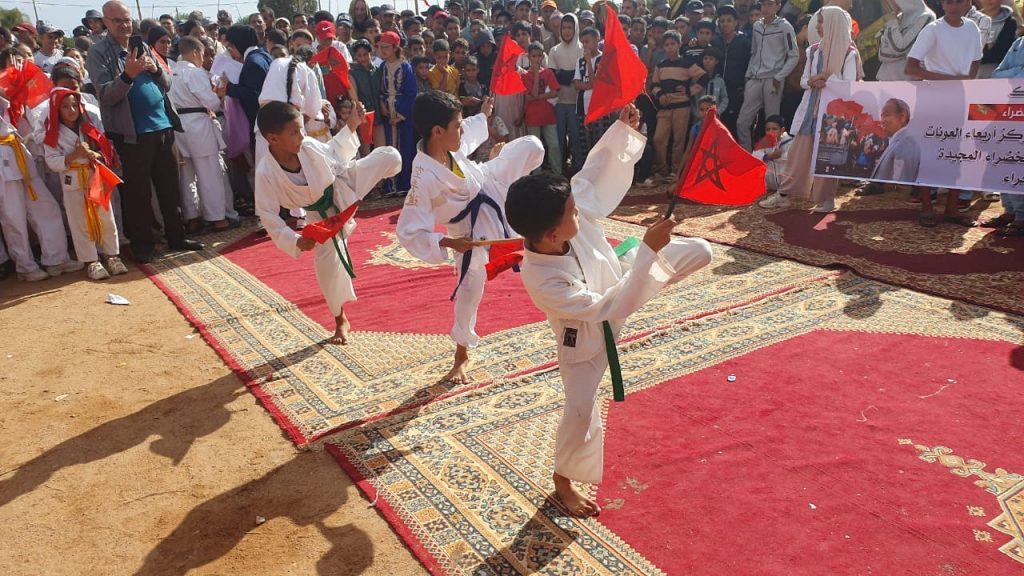 عرفت فقرات الحفل تنوعاً كبيراً بين العروض الرياضية التي أبدع فيها أطفال وشباب المنطقة، خاصة في فن التيكواندو، إلى جانب عروض الخيالة التي أضفت طابعاً تراثياً أصيلاً، استحضر من خلاله الحاضرون قيم الشجاعة والانتماء للوطن، كما عرفت المناسبة لحظات مميزة رفرف فيها العلم الوطني عالياً على أنغام الأناشيد الوطنية والهتافات التي تعبر عن حب الوطن والاعتزاز بمسيرته التنموية المتواصلة.