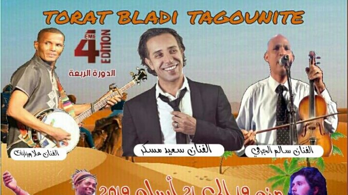 تنظم جمعية أجيال درعة لإحياء المورو ث المحلي والتنمية بتاكونيت بدعم من وزارة الثقافة و الاتصال ، و دار الثقافة بزاكورة والمجلس الإقليمي بزاكورة و المديرية الجهوية لوزارة الثقافة و الاتصال جهة درعة تافيلالت و المديرية الإقليميةلوزارة الثقافة بورزازات ،وكذا الجماعة الترابية بتاكونيت الدورة الرابعة المهرجان الدولي تراث بلادي بتاكونيت تحت شعار “الموروث الثقافي تاريخ وحضارة:مؤهلات في خدمة التنمية”. وذالك في إطار الاحتفال بشهر تراث و سيرا على نهجها منذ تأسيسها و وفاءا لبرنامجها السنوي ، وذلك أيام 19و20و21أبريل2019.