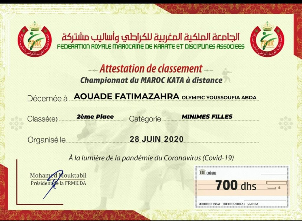 فاطمة الزهراء عواد اجتازت بنجاح المنافسات الجهوية و الشطرية لتصل الى النهائيات، حيث استطاعت المنافسة ضد أقوى بطلات رياضة الكراطي على الصعيد الوطني و حققت الفوز بالميدالية الفضية و الحصول على المرتبة التانية بعد مجهودات كبيرة بدلتها خلال هذه المنافسات.